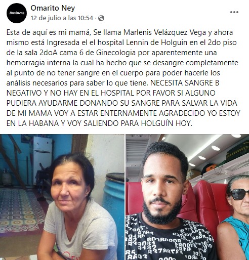 “En estos momentos está grave en el salón a base de sueros, con la hemoglobina en cinco y necesita más donaciones de sangre y el hospital me dice que las busque yo, pero ya agoté todas las vías que tenía, ya no sé qué hacer, por eso hago esta publicación para sí alguna persona es del grupo sanguíneo O negativo o conoce a alguien con este grupo por favor decirle que me llamen si están dispuestos a donar y salvar la vida de mi madre”, fue el grito de ayuda que lanzó este hijo cubano.