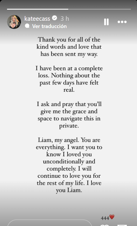 La pareja de Payne, Kate Cassidy, rompió el silencio en medio del trágico suceso y expresó su dolor en un emotivo mensaje en Instagram. Agradeció el apoyo recibido y pidió privacidad para poder afrontar esta difícil situación. En su publicación, describió a Payne como su “ángel” y expresó su amor incondicional hacia él. “Gracias por todas las amables palabras y el amor que me han enviado. He estado completamente perdida. Quiero que sepas que te he amado incondicional y completamente. Te seguiré amando el resto de mi vida”, escribió Cassidy.