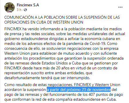 En un comunicado oficial divulgado por las redes sociales de Fincimex se “reitera que la interrupción del servicio de remesas entre los dos países es responsabilidad única y exclusiva del gobierno de los Estados Unidos y ratifica su voluntad y compromiso con la familia cubana en aras de identificar y sostener flujos ordenados y seguros de remesas”.