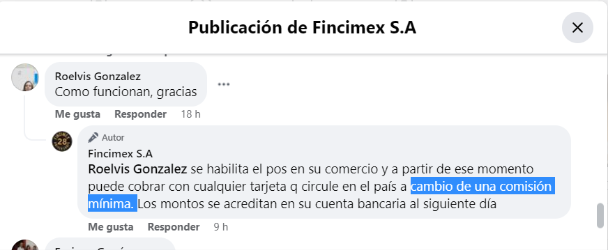 De acuerdo con una publicación en su perfil oficial de Facebook, el propietario del comercio establece contrato con Fincimex, que instala el POS, y a partir de ese momento puede cobrar con cualquier tarjeta que circule en el país a cambio de una “comisión mínima”.