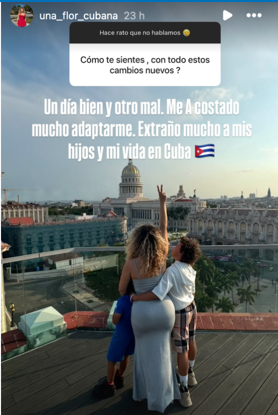 En una publicación reciente, la influencer compartió cómo se siente con los cambios que ha experimentado desde su llegada al país. “Un día bien y otro mal. Me ha costado mucho adaptarme. Extraño mucho a mis hijos y mi vida en Cuba”, expresó Flor en respuesta a una pregunta de uno de sus seguidores.
