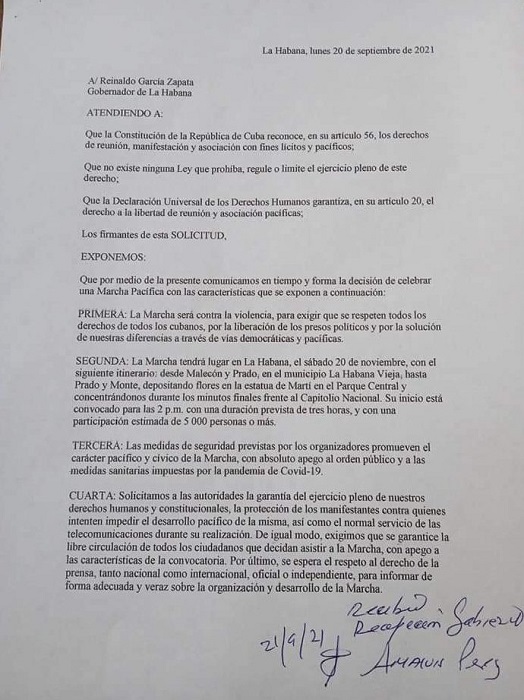 La carta, que avisa sobre la protesta, fue entregada en la recepción del Gobierno Provincial de La Habana, en la oficina del Intendente y en el Consejo de la Administración de La Habana Vieja. En los próximos días también se enviarán documentos similares a autoridades de otras zonas del país.
