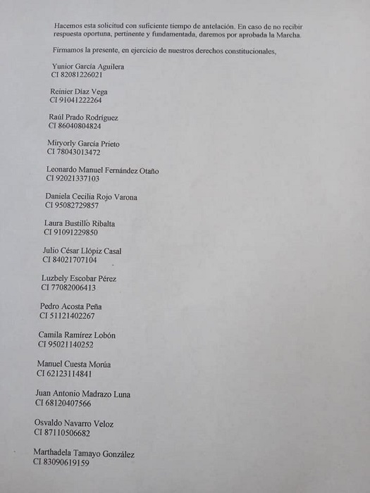 En la carta también se pide a las autoridades garantizar la seguridad de los manifestantes, el normal servicio de las telecomunicaciones y la libre circulación de todos los ciudadanos que deseen participar en la marcha.