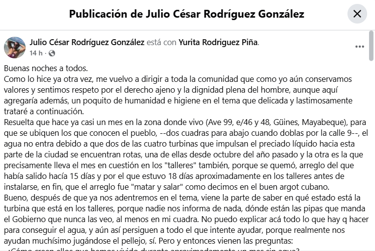 La falta de agua desde hace un mes en Güines, provincia de Mayabeque, ha causado una creciente preocupación entre los residentes. Julio César Rodríguez González, un vecino de la zona, denunció en Facebook que dos de las cuatro turbinas que suministran agua a la localidad están rotas y el régimen castrista no hace nada para solucionar el problema y garantizar un servicio tan básico.