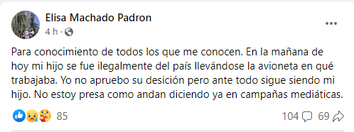 “Para conocimiento de todos los que me conocen. En la mañana de hoy mi hijo se fue ilegalmente del país llevándose la avioneta en que trabajaba. Yo no apruebo su decisión, pero ante todo sigue siendo mi hijo. No estoy presa como andan diciendo ya en campañas mediáticas”, refirió la mujer en cuyo perfil de Facebook se describe como trabajadora de la Empresa Eléctrica de Villa Clara.