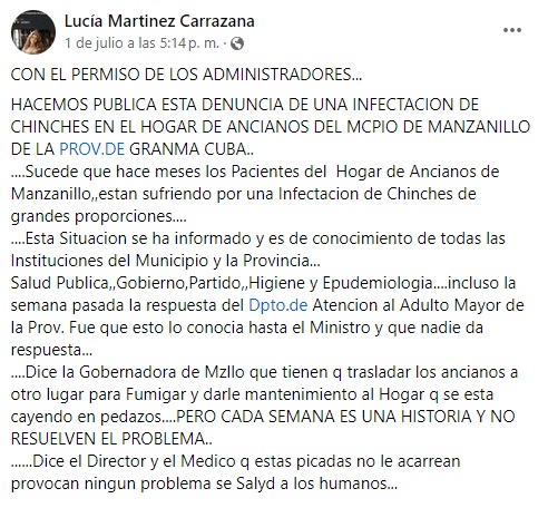 Lucía Martínez Carrazana, una internauta de Facebook, fue la encargada de exponer la penosa situación que atraviesan los adultos mayores, la cual no ha recibido la correcta atención por parte de las autoridades comunistas.