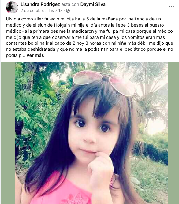 En la provincia Holguín otra niña ha muerto como consecuencia de la negligencia médica y del abandono del estado a sus ciudadanos. La lamentable noticia fue confirmada por Lisandra Rodríguez, la madre de la menor, quien a través de su perfil de Facebook realizó la denuncia con el objetivo de que casos como este “no vuelvan a suceder”.