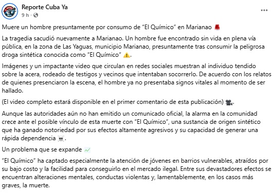 Un hombre fue hallado muerto en plena vía pública en la zona de Las Yaguas, del municipio de Marianao, La Habana. Aunque las autoridades no han confirmado oficialmente las causas del fallecimiento, los vecinos de la zona temen que este suceso haya sido producto de una sobredosis de la droga conocida como El Químico.