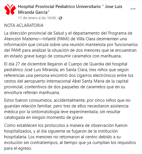Tres menores de edad necesitaron ser internados en el Hospital Provincial Pediátrico Universitario “José Luis Miranda García” de Villa Clara tras consumir caramelos de marihuana, según reconoció la propia institución sanitaria en su perfil oficial de Facebook.