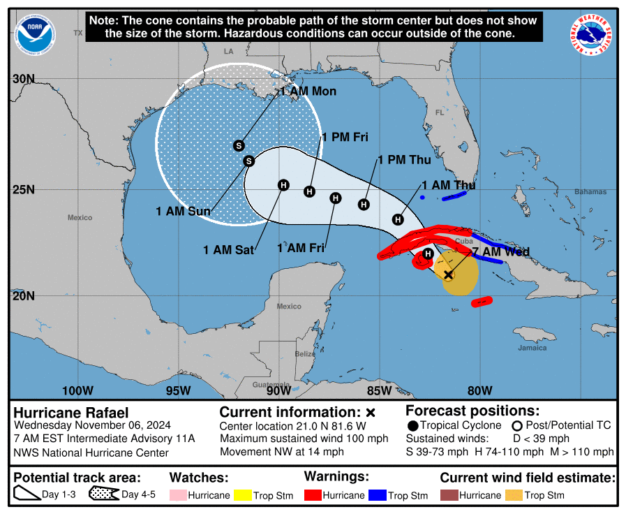 Según el Centro Nacional de Huracanes de Estados Unidos, a las 7:00 a.m., el ojo del Rafael se ubicaba cerca de la latitud 21.0 Norte y longitud 81.6 Oeste. El movimiento de traslación es hacia el noroeste a una velocidad de 14 mph (22 km/h), y se anticipa que mantenga esta dirección durante los próximos dos días, seguido de un giro gradual hacia el oeste-noroeste en el Golfo de México.