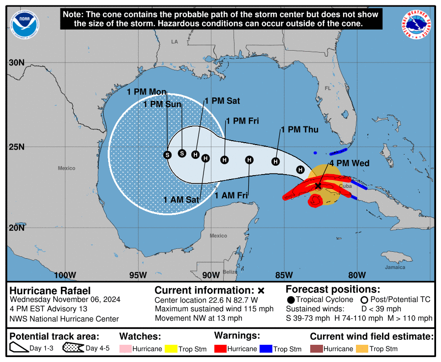Se espera que el huracán cruce la Isla y salga por la costa norte, entre Pinar del Río y Artemisa, cerca de Bahía Honda, manteniendo condiciones extremas hasta bien entrada la noche. El recorrido de Rafael por territorio cubano demorará entre tres y cuatro horas.