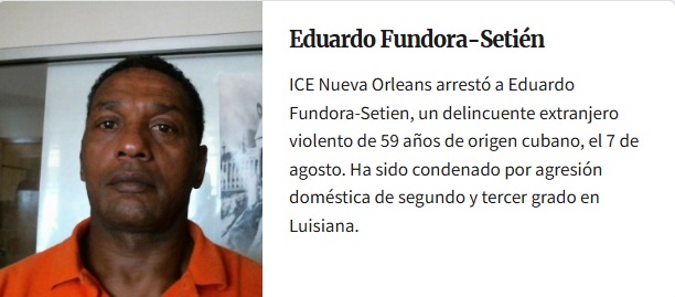 Según el comunicado oficial de ICE, Fundora Setién tiene antecedentes de agresión doméstica de segundo y tercer grado. Existe una alta probabilidad de que sea deportado en próximos días, pero podría no ser aceptado de regreso a la Isla a causa de sus antecedentes penales.