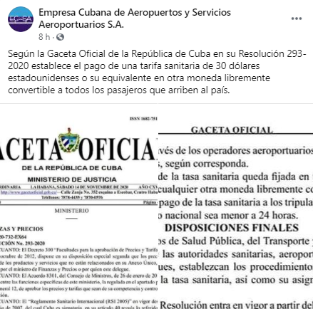 El Gobierno cubano estableció de forma oficial la obligatoriedad del pago de una tarifa de control sanitario que incluye la realización de la prueba PCR para todos los viajeros que arriben al país. Según la Resolución 293/2020 publicada en la Gaceta Oficial Extraordinaria con fecha 14 de noviembre, el pago quedó fijado en 30 dólares estadounidenses o su equivalente en otras monedas.
