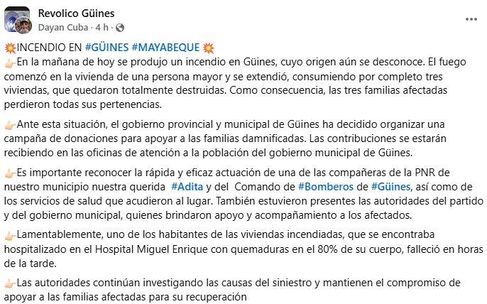 El perfil de la página Revolico Güines también compartió imágenes del fuego y el resultado del incendio. Ante ello, usuarios tanto de Cuba como del extranjero se han mostrado dispuestos a ayudar a los damnificados, quienes perdieron todo en el siniestro.