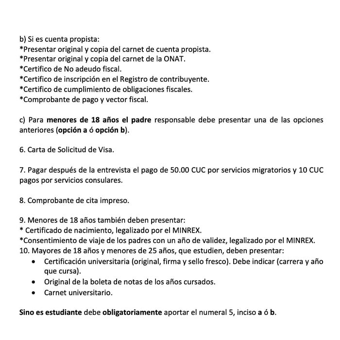 En el caso de menores de 18 años, el padre responsable debe presentar una carta de solicitud de visa, así como certificado de nacimiento y consentimiento de los padres para el viaje del menor, ambos legalizados por el Ministerio de Relaciones Exteriores (Minrex).