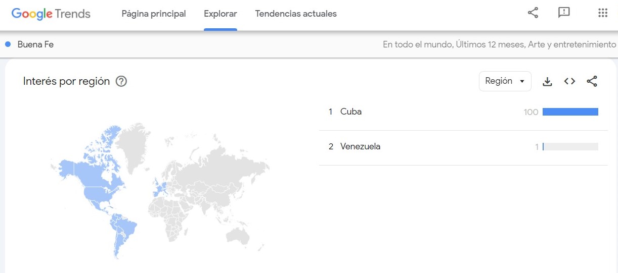 Google Trends refleja que, en los últimos 12 meses, a nivel mundial, la audiencia no había realizado búsquedas sobre el dúo Buena Fe, a pesar de las giras realizadas por el grupo en Europa y Latinoamérica. Tan solo en Cuba y de manera mínima en Venezuela, la agrupación ha tenido búsquedas en Google.