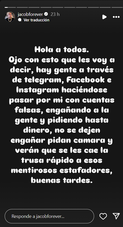 En una publicación en sus stories, Jacob Forever advirtió a su público sobre estas cuentas fraudulentas. Según explicó, los impostores están pidiendo dinero y adoptando comportamientos deshonestos en su nombre.