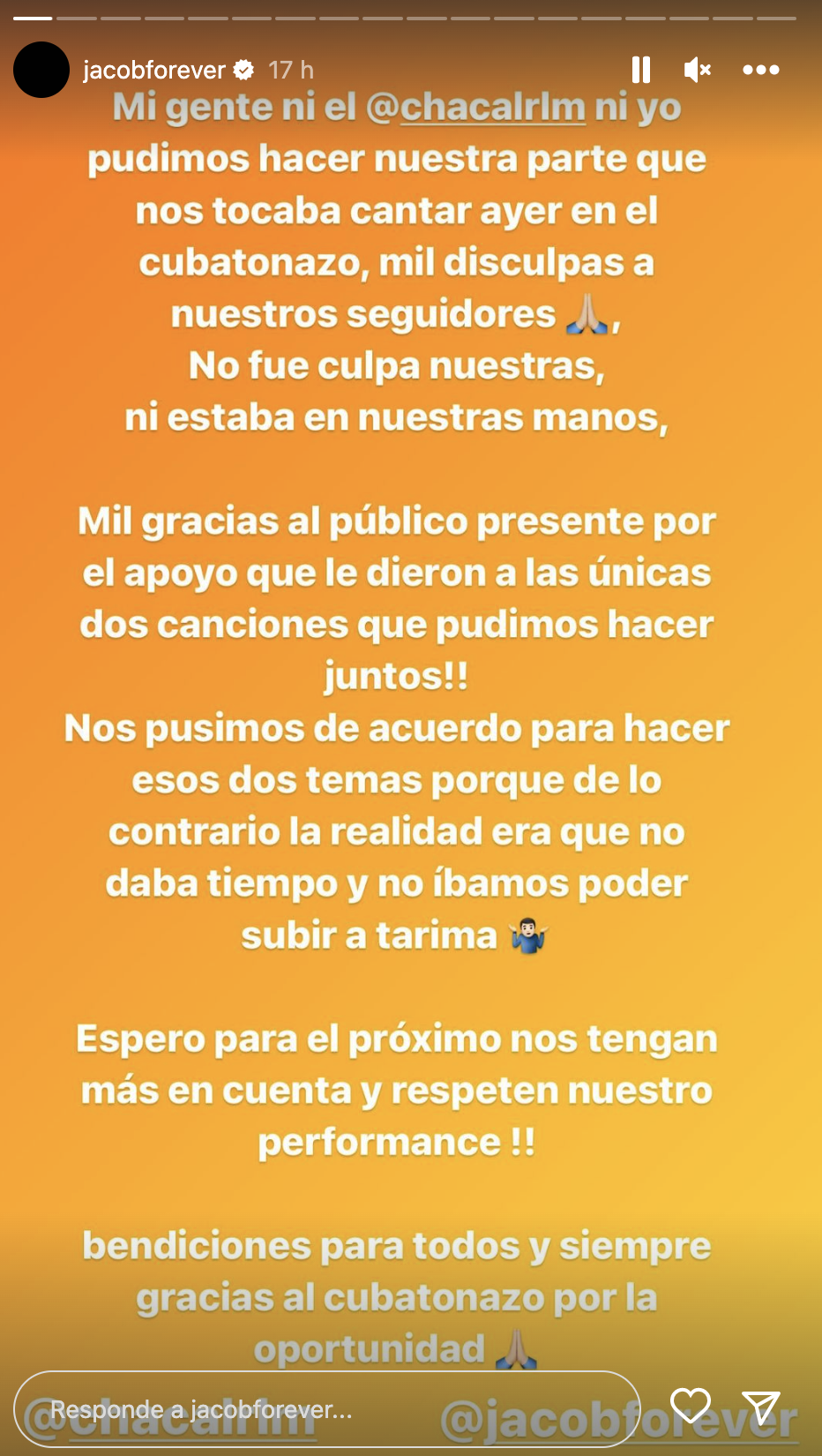 “Mi gente, ni el @chacalrlm ni yo pudimos hacer nuestra parte que nos tocaba cantar, ayer en el Cubatonazo, mil disculpas a nuestros seguidores. No fue culpa nuestra ni estaba en nuestras manos”, escribió el exintegrante de Gente de Zona, que agradeció al público por el respaldo a las “dos únicas canciones que pudimos hacer juntos”.