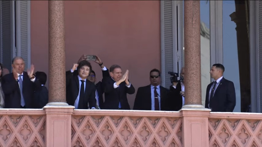 El punto culminante llegó cuando Milei y González Urrutia salieron al balcón principal de la Casa Rosada, donde saludaron a la multitud venezolana que cubría un tercio de la Plaza de Mayo. Al grito de “¡Viva la Libertad!” y “Edmundo presidente!”, los asistentes ondeaban banderas y coreaban con entusiasmo. Muchas personas llegaron desde temprano para asegurarse un lugar cercano a la reja.