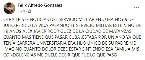 “¿Cuánto más tiene que pasar en Cuba? Estaba por un año, ya que tenía carrera universitaria, era hijo único, me imagino cuánto dolor debe estar sintiendo esa familia, mis condolencias”, dijo Félix Alfredo González al compartir la noticia en dicha red social.