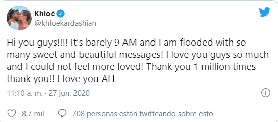 Khloé Kardashian compartió en Twitter un mensaje de agradecimiento para quienes recordaron la fecha. “Son las 9 am y estoy inundada de tantos mensajes dulces. ¡Los amo mucho y no podría sentirme más amada!”, escribió la festejada en la red social.