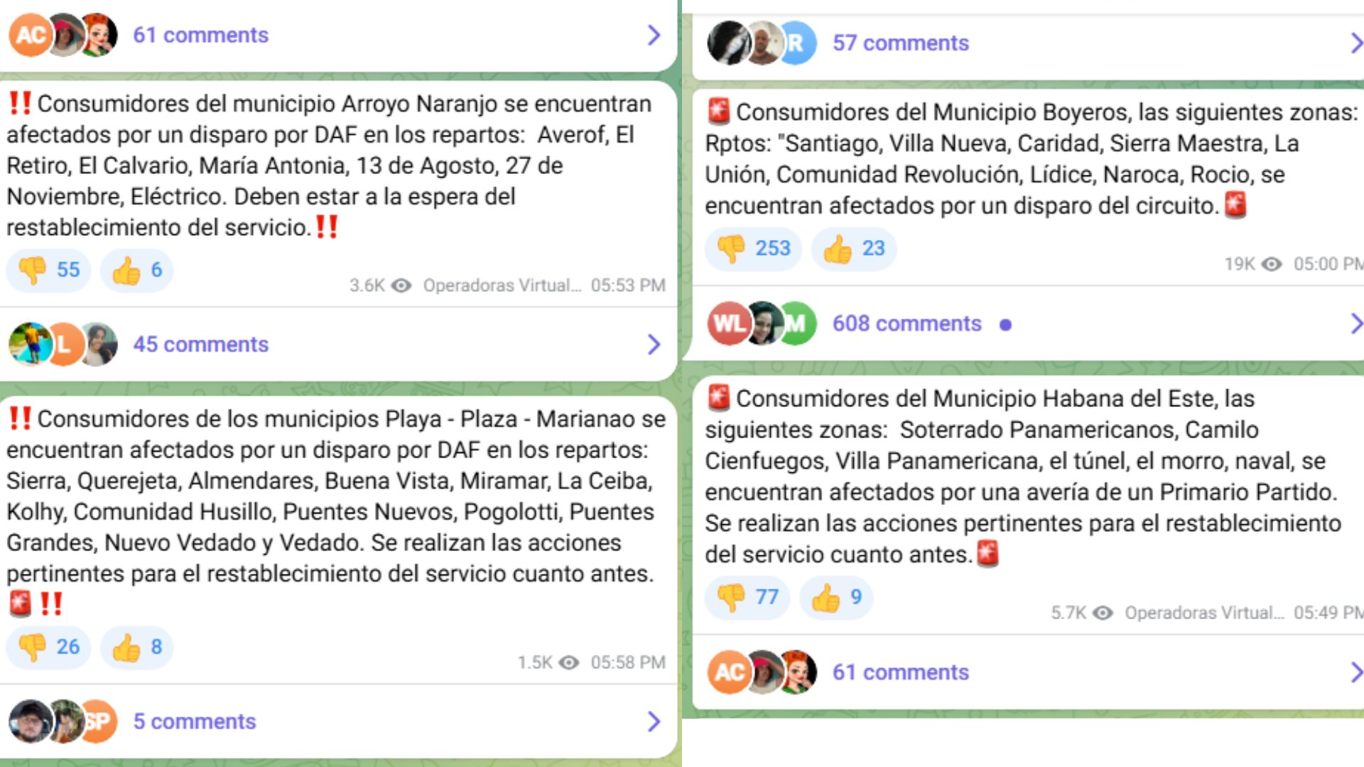 “Guanabacoa Nalón aún no tiene luz hay alguna avería o algo más???”; “Venga, que en cualquier momento se le vuelve a disparar el SEN”; “Hasta cuando Guanabo sin luz ya esto es abusivo”; “Bloque 3 qué pasó no es fácil hasta cuándo es esto dios miooo”, expresaron otros.