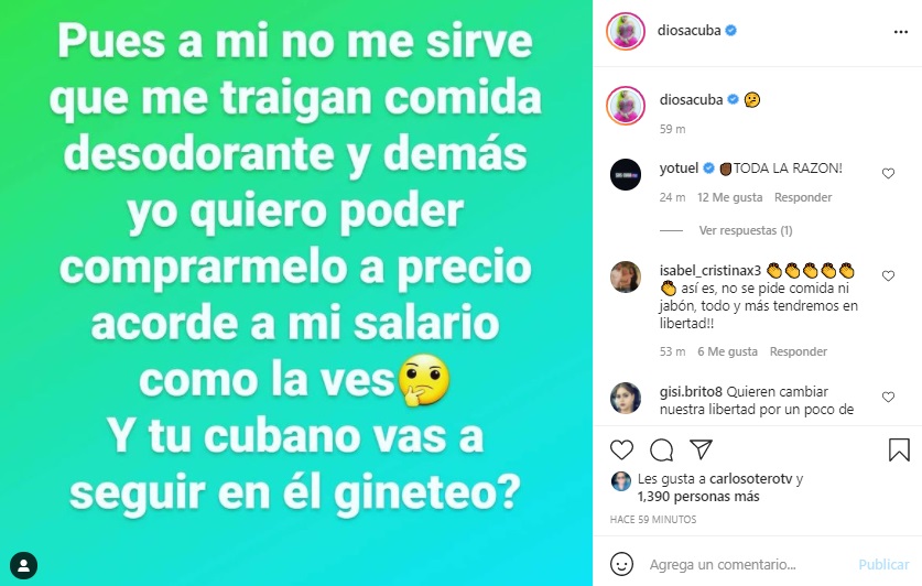 La cantante cubana Dianleys Alfonso, más conocida como la Diosa de Cuba, reaccionó a las recientes declaraciones del gobierno donde se autorizó la importación sin límites de alimentos, medicinas y aseo al país.
