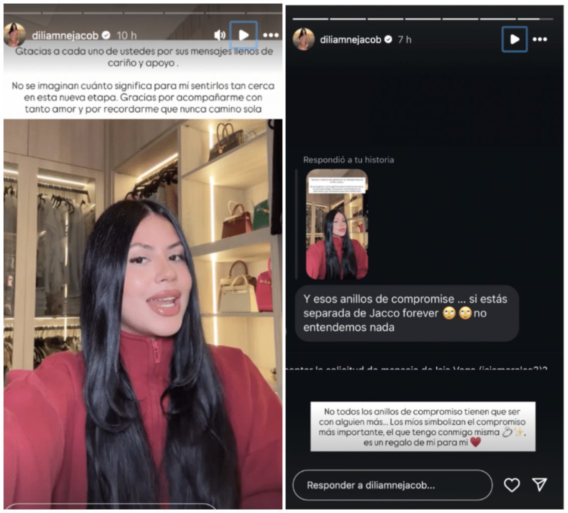 Sin embargo, un detalle que no ha pasado desapercibido es el anillo de compromiso que Diliamne sigue luciendo en su dedo, lo que ha causado confusión entre sus seguidores. En una historia reciente en Instagram, una seguidora no dudó en cuestionar el hecho: “¿Y esos anillos de compromiso si estás separada de Jacob?”.