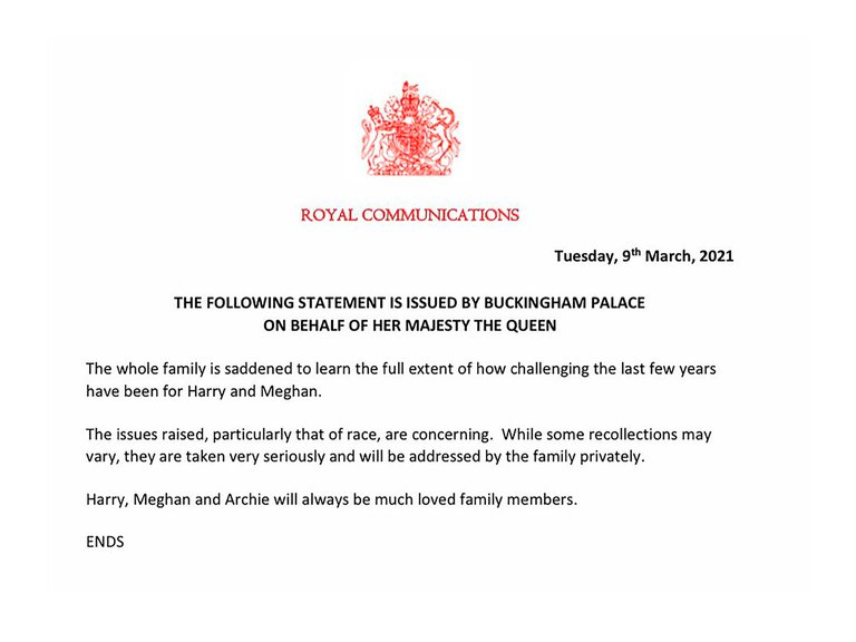 La reacción oficial de la Reina británica a través de su comunicado, pretende terminar con todas las especulaciones que se han levantado tras la explosiva entrevista, especialmente aquella que tiene que ver con el supuesto racismo dentro de su propia familia.