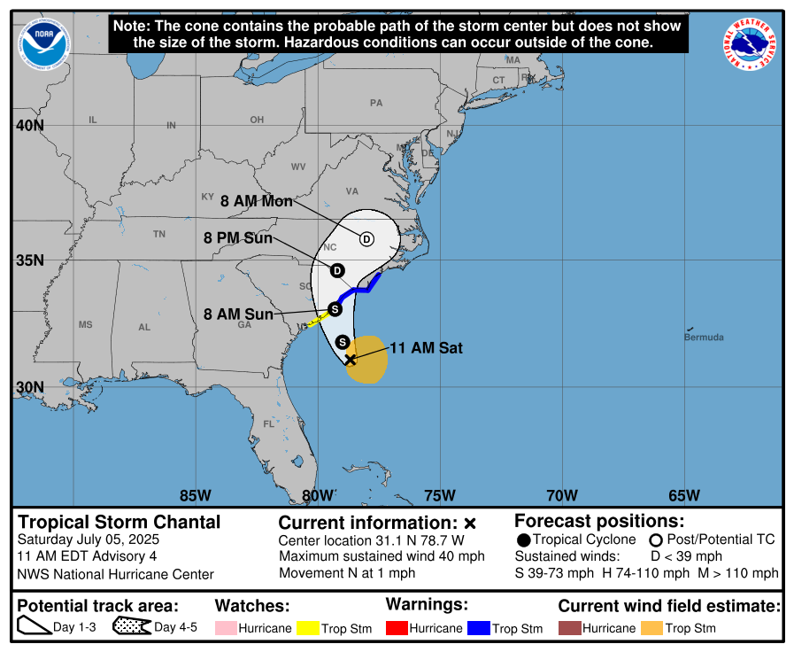 El NHC indicó que Chantal se moverá a través de la costa de Carolina del Sur el domingo por la mañana. A medida que se acerca a tierra, se espera que la tormenta se fortalezca, con vientos máximos sostenidos cerca de 64 km/h y ráfagas más fuertes.