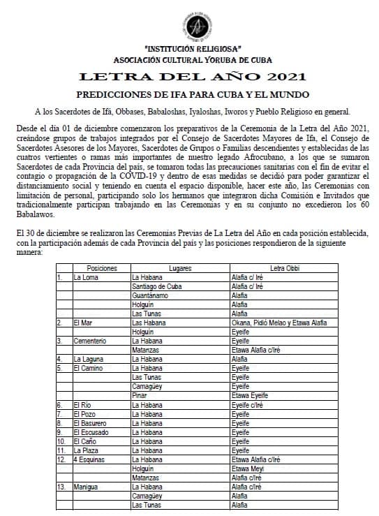 En la madrugada de este 1ro de enero un grupo de sacerdotes cubanos de la religión Yoruba dio a conocer la Letra del Año del 2021 para Cuba, la cual tiene como principal profecía “Un bien de salud firme y seguro en la tierra que va a proporcionar Orula”.