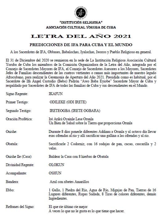 En la madrugada de este 1ro de enero un grupo de sacerdotes cubanos de la religión Yoruba dio a conocer la Letra del Año del 2021 para Cuba, la cual tiene como principal profecía “Un bien de salud firme y seguro en la tierra que va a proporcionar Orula”.