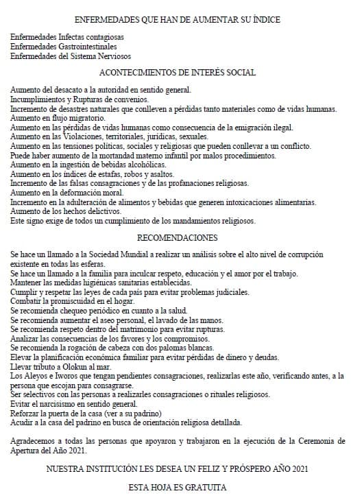 El 31 de Diciembre de 2020 se reunieron en la sede de La Institución Religiosa Asociación Cultural Yoruba de Cuba los miembros de la Comisión Organizadora de la Letra del Año, integrada por el Consejo de Sacerdotes Mayores de IFA, el Consejos de Sacerdotes Asesores a los Mayores, Sacerdotes Jefes de Familia descendientes de las cuatro vertientes o ramas más importantes de nuestro legado Afrocubano, para realizar la Ceremonia de Apertura del Año 2021. Presidida como es habitual por el Sacerdote de Ifá Ángel Custodio (Bebo) Padrón “Awo Baba Eyiobe” Sacerdote Mayor de Cuba y respaldado por Sacerdotes de IFA de todas las familias de Cuba y sus descendientes en el Mundo.