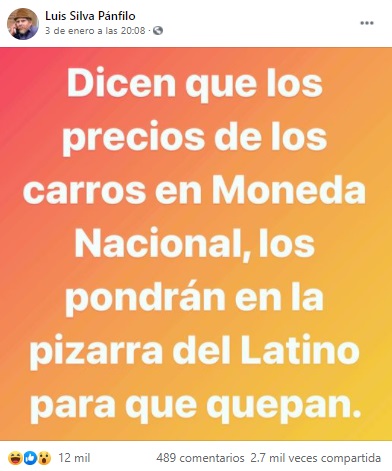 “Los precios de los carros en moneda nacional los pondrán en la pizarra del Latino para que quepan”, escribió en sus redes sociales.