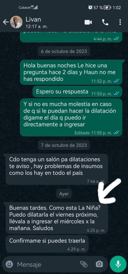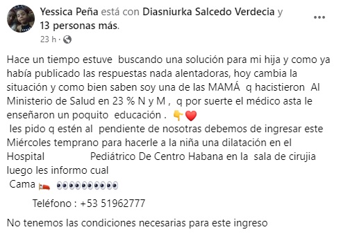 Sin embargo, el sábado, el galeno se puso en contacto con la mujer para preguntar por el estado de salud de la niña y programar su ingreso el próximo miércoles, con la cirugía prevista para el viernes en el Hospital Pediátrico Docente de Centro Habana.