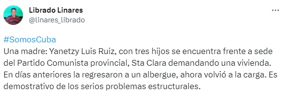 La madre cubana Yanetzy Luis Ruiz, acompañada por sus tres hijos pequeños, se plantó frente a la sede provincial del Partido Comunista de Cuba (PCC) en la ciudad de Santa Clara para exigir una vivienda digna donde residir. La noticia fue denunciada por el opositor cubano Librado Linares, secretario general del Movimiento Cubano Reflexión.