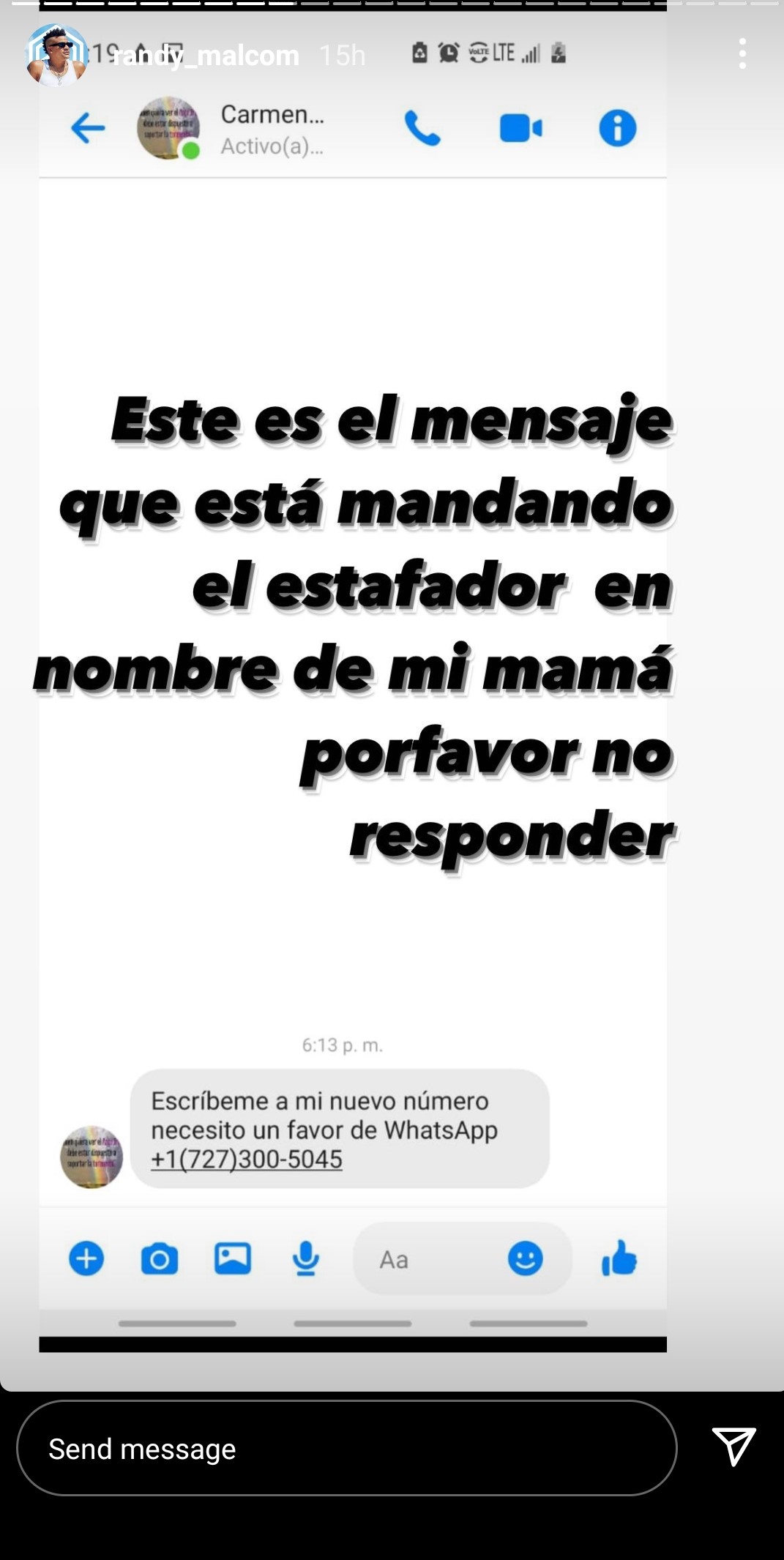 En sus historias en Instagram, el músico dijo sentirse apenado porque varias personas ya habían sido estafadas. Fueron amigas de su madre que, sin pensar que fuera un golpe, enviaron dinero a una cuenta falsa.