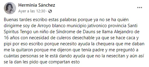 Una madre cubana llamada Herminia Sánchez recurrió a las redes sociales en busca de ayuda para su hijo Alejandro, un joven de 16 años que padece síndrome de Down en la provincia de Sancti Spíritus. La desesperación de esta mujer se centra en la imposibilidad de conseguir pañales desechables para el muchacho.