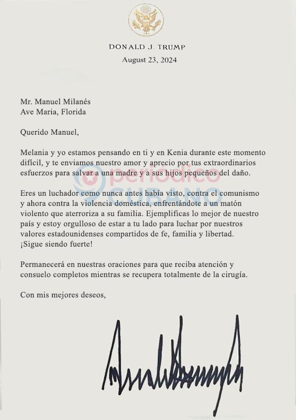El expresidente Donald Trump envió una carta al empresario cubano Manuel Milanés, luego de que este resultara herido en un altercado el pasado 22 de agosto. En su misiva, Trump le agradece por sus “extraordinarios esfuerzos para salvar a una madre y a sus hijos pequeños del daño.”