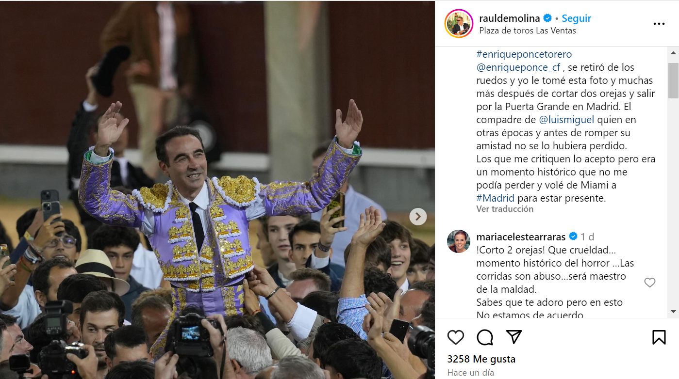 “Anoche el maestro Enrique Ponce se retiró de los ruedos y yo le tomé esta foto y muchas más después de cortar dos orejas y salir por la Puerta Grande en Madrid”, escribió el conductor del programa El Gordo y la Flaca, consciente de que el tema de las corridas de toros es polémico y que su presencia en el evento podría generar críticas. Añadió una aclaración: “Los que me critiquen lo acepto, pero era un momento histórico que no me podía perder y volé de Miami a Madrid para estar presente”.
