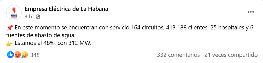 Según una información oficial de la Unión Eléctrica (UNE) en horas de la mañana del sábado solo 413.188 clientes tenían servicio, incluidos 25 hospitales y 6 fuentes de agua, lo que representa apenas el 48% de recuperación de la red capitalina. En total se generan solo 312 MW. Muchos barrios siguen sin electricidad, especialmente en municipios como Plaza y Cerro, donde aún se registran numerosos postes y cables caídos.