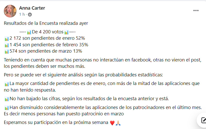 La usuaria Ana Carter, promotora de estas encuestas de forma semanal, explica que las cifras de la semana que concluyó el 31 de marzo con relación a los casos pendientes de enero “no han bajado, según los resultados de la encuesta anterior”.