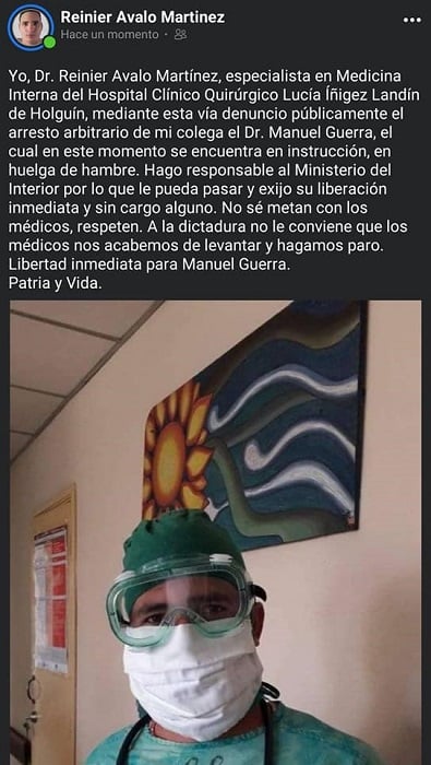 Entre los médicos que piden la liberación de Guerra se encuentra el especialista en medicina interna Reiner Avalo Martínez, quien responsabilizó al Ministerio del Interior por lo que pueda suceder con el galeno.