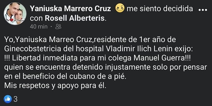 Yaniuska Marrero Cruz, residente de primer año de ginecobstetricia en el hospital Vladimir Ilich Lenín, también pidió la excarcelación de Guerra y lamentó que hubiese sido detenido solo por pensar a favor de los cubanos de a pie.