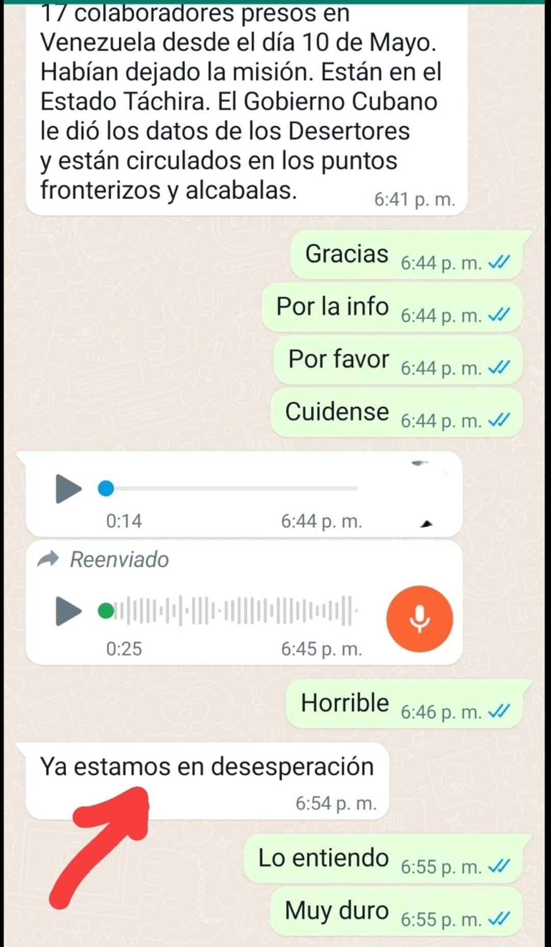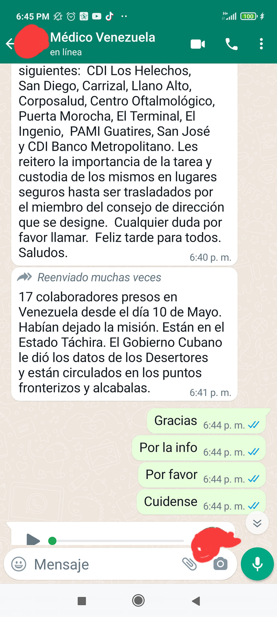 En su publicación, Ruano Sánchez adjunta capturas de pantalla de conversaciones de WhatsApp donde los jefes de distritos de la misión médica cubana en Venezuela acrecientan los operativos, para controlar al personal sanitario y evitar nuevas deserciones.