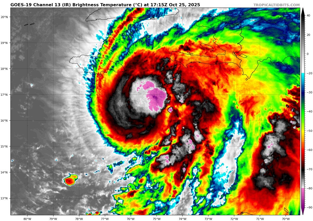 A las 2:00 p.m. el centro del huracán Melissa se encontraba a unos 230 kilómetros al sureste de Kingston, Jamaica, y a 380 kilómetros al suroeste de Puerto Príncipe, Haití. Con vientos máximos sostenidos de 120 km/h y un movimiento todavía muy lento de 2 km/h hacia el noroeste. Se espera que Melissa se acerque o pase cerca de Jamaica durante el fin de semana, y que llegue a Cuba a mediados de la próxima semana.