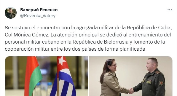 Valery Revenko, jefe del Departamento de Cooperación Militar Internacional de Bielorrusia, y la coronela Mónica Milian Gómez, agregada militar de la Embajada de Cuba en Rusia y Bielorrusia, sostuvieron una reunión donde acordaron principalmente “el entrenamiento del personal militar cubano en la República de Bielorrusia y el desarrollo de la cooperación militar entre los dos países de manera planificada”.