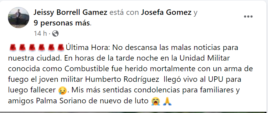 Un trágico incidente tuvo lugar el pasado domingo 11 de junio, cuando el joven cubano Humberto Rodríguez perdió la vida a causa de un disparo recibido mientras hacía una guardia en cumplimiento del Servicio Militar Activo (SMA) en Palma Soriano, Santiago de Cuba.