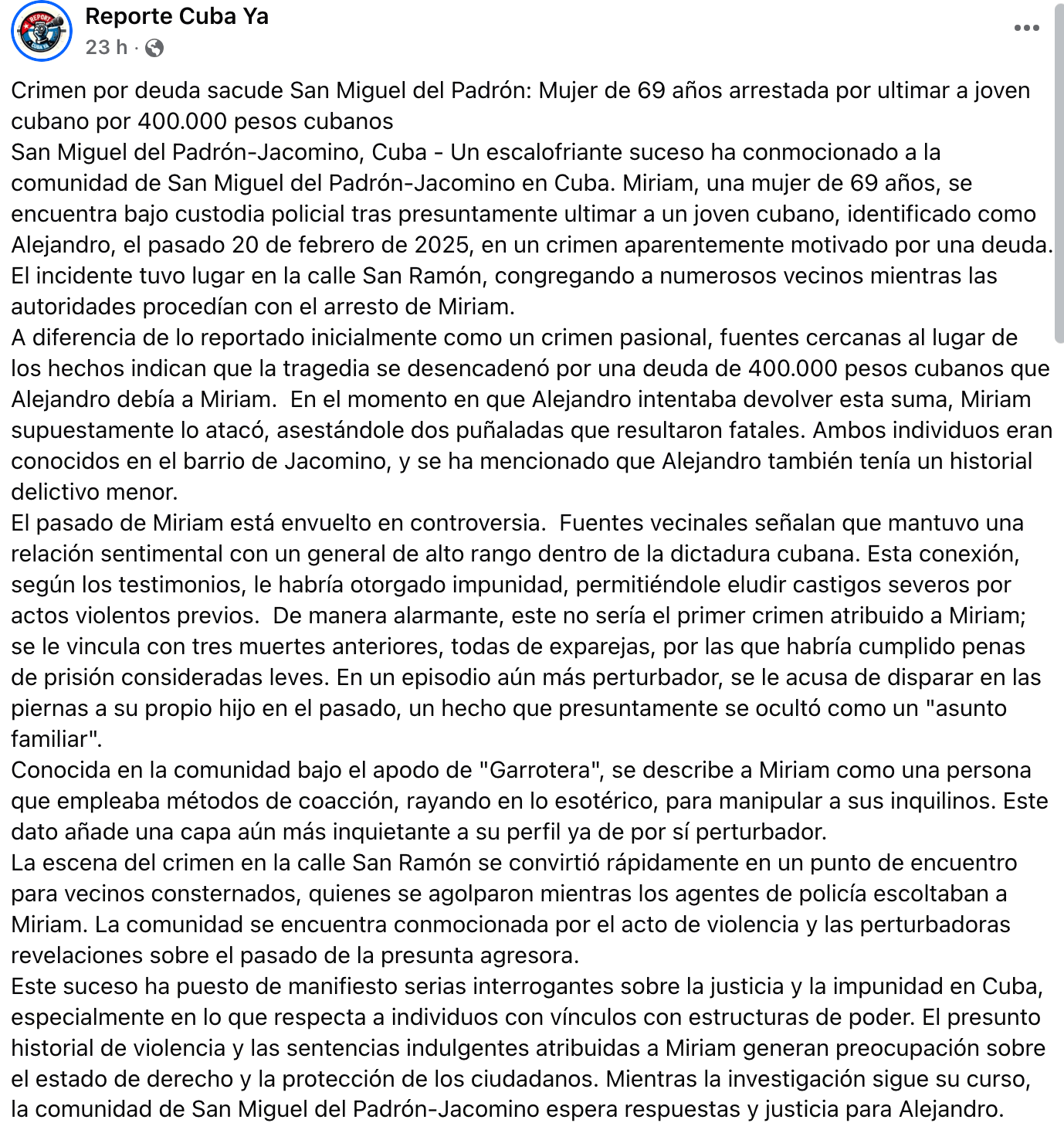 Según informaron desde la página de Facebook Reporte Cuba Ya, el pasado jueves 20 de febrero, Alejandro, un joven cubano, fue asesinado tras recibir dos puñaladas de Miriam Rondón, una mujer de 69 años, en un crimen aparentemente motivado por una deuda de 400.000 pesos cubanos.