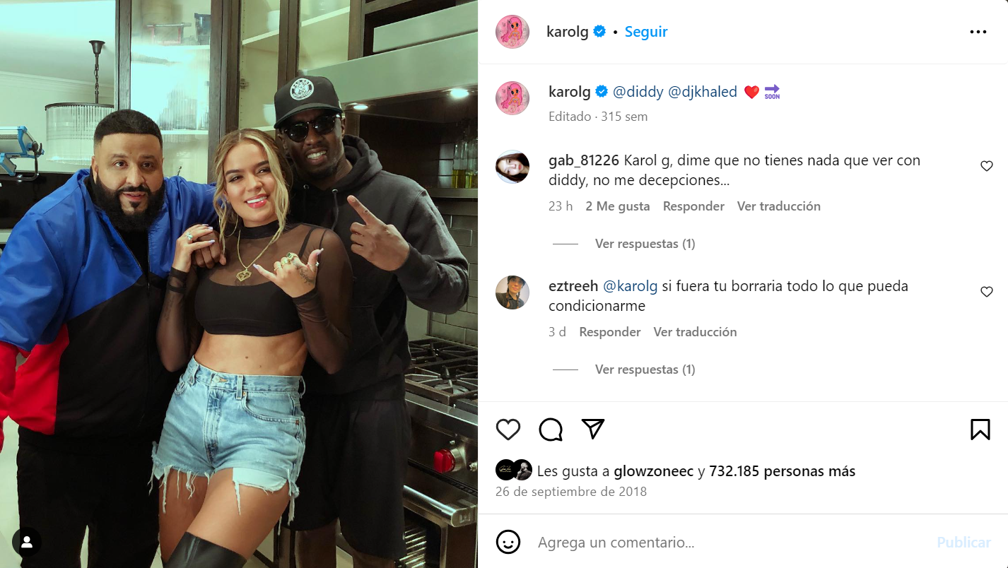 Cientos de seguidores pidieron a la Bichota que eliminara esta foto con el rapero enjuiciado: Karol g, dime que no tienes nada que ver con Diddy, no me decepciones…”, “si fuera tú borraría todo lo que pueda condicionarme”, “Karol por favor sabes lo grave que es esto… no lo permitas tú no eres así”, “Una de las pocas que no ha quitado está foto de su perfil, no como otros que hasta han huido del país”, fueron algunos de los mensajes que le dejaron al pie de la publicación que data de hace unos seis años.